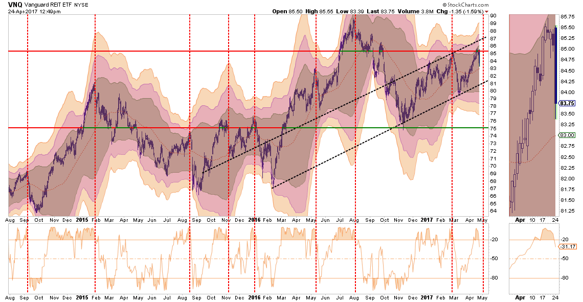 REIT’s have performed well despite the Fed’s ongoing rate hiking campaign. With rates now very overbought, as discussed below, take profits in REIT’s short-term and look for a pullback to trend-line support around $81 to add new positions. A stop should be placed at $80.