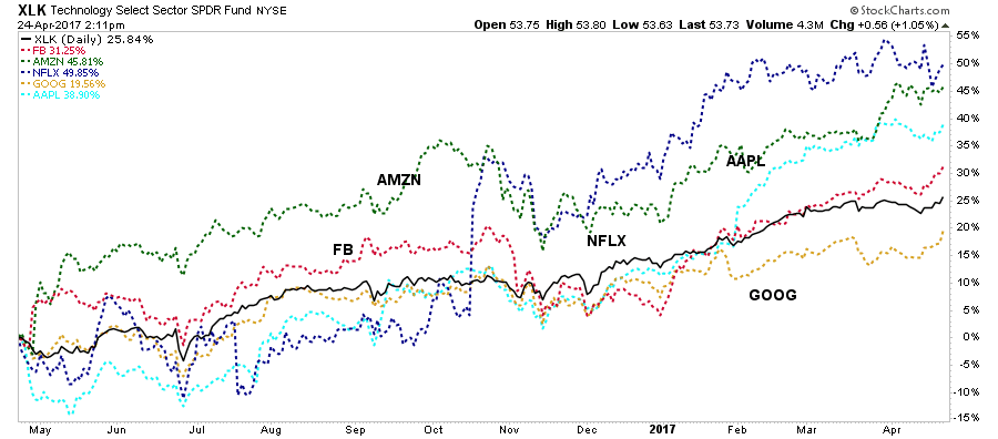 The so-called FANG stocks (FB, AMZN/AAPL, NFLX, GOOG) continue to push higher, and due to their large weightings in the index, push the index up as well.