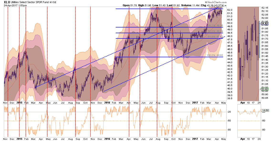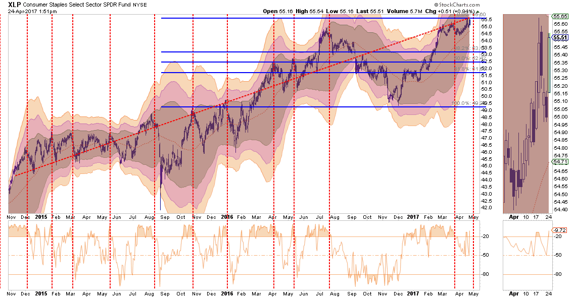 Back in January, I discussed the “rotation” trade into Utilities and Staples. That performance shift has played out nicely and the sector is now extremely overbought.