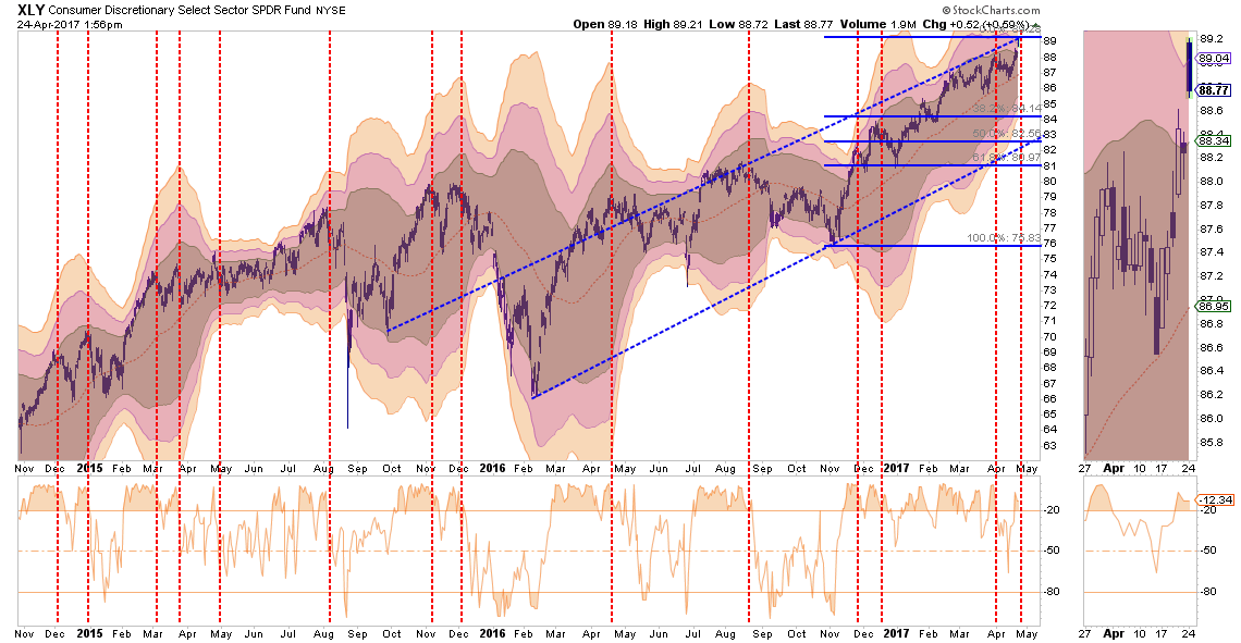 Discretionary has been running up in hopes the pick-up in consumer confidence will translate into more sales. There is little evidence of that occurring currently as retail stores are rapidly losing sales and fighting the “retail apocalypse.”. However, with discretionary stocks at highs, profits should be harvested.