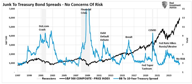 While there are several credit spreads to monitor, the high-yield (or junk bond) spread versus Treasury yields is considered the most reliable. That spread has been a reliable predictor of market corrections and bear markets. The high-yield bond market consists of debt issued by companies with lower credit ratings. Such makes them more vulnerable to economic slowdowns. As such, when investors become concerned about economic prospects, they demand significantly higher returns to hold these riskier bonds. When that happens, the spreads widen warning of increasing risks.