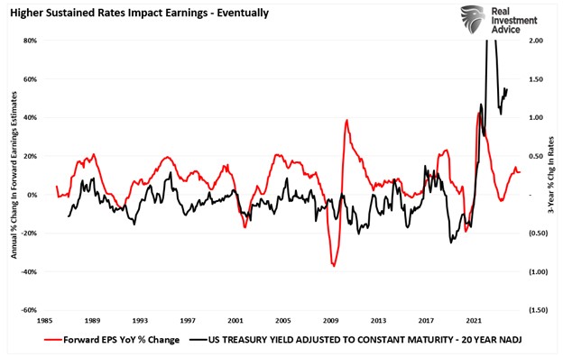 Furthermore, increases in interest rates negatively impact corporate earnings as borrowing costs increase. Therefore, while rising interest rates do not immediately impair earnings growth, eventually, they do as economic growth slows.