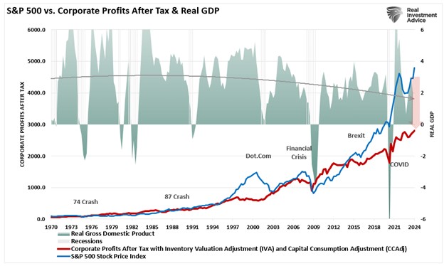 Since 1947, earnings per share have grown at 7.72%, while the economy has expanded by 6.35% annually. That close relationship in growth rates is logical, given the significant role that consumer spending has in the GDP equation. However, while nominal stock prices have averaged 9.35% (including dividends), reversions to underlying economic growth will eventually occur. Such is because corporate earnings are a function of consumptive spending, corporate investments, imports, and exports. The same goes for corporate profits, where stock prices have significantly deviated.