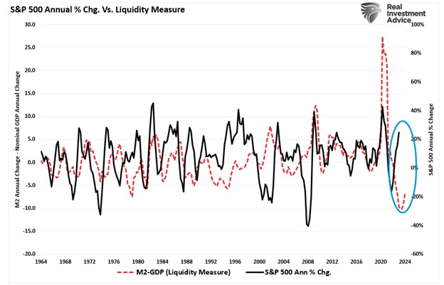 So, either the annualized rate of return from the S&P 500 will decline due to repricing the market for lower-than-expected earnings growth rates, or the liquidity measure is about to turn sharply higher.