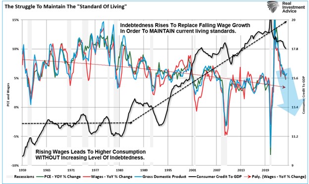 This decline in economic growth over the past 40 years has kept the average American struggling to maintain their standard of living. As their wages declined, they turned to credit to fill the gap and maintain their current standard of living. This demand for credit became the new breeding ground for the financed-based economy. More accessible credit terms, lower interest rates, easier lending standards, and less regulation fueled the continued consumption boom. While the economy surged with the “free money” sent to households, reversing that benefit will eventually return the economy, wage growth, and consumption to the ongoing long-term downtrend.