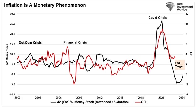 Milton Friedman’s statement is supported by the chart below showing the M2 money supply compared to inflation (with a 16-month lag).