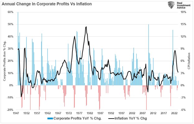In 2020 and 2021, corporations could pass on most of the inflationary increase to consumers as they were willing to spend the Government’s money. However, as excess savings run out, inflation declines as consumers decrease spending. Corporate profits weaken as the ability to pass on higher input costs to customers fades. As shown, as inflation declines, the rate of change in corporate profits also weakens.