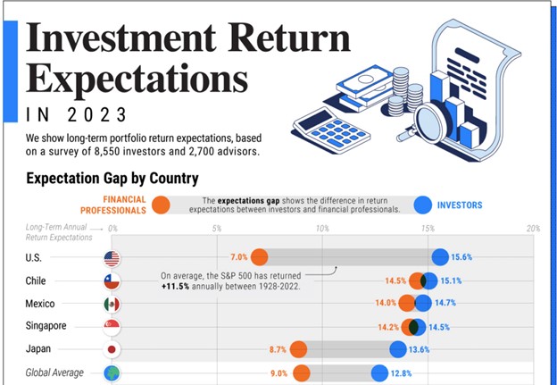 A stunning post from VisualCapitalist showed a poll of 8,550 investors and 2,700 advisors and the gap between the two of future portfolio return expectations. While the poll was global, I will focus on domestic portfolio return expectations.