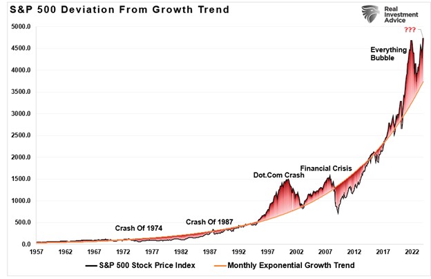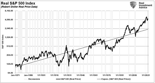 During the last decade, those fiscal and monetary inputs fostered history’s most significant asset bubble. In 2020, the pandemic started the needed reversal of those excesses but was cut short by massive monetary and fiscal interventions. The current deviation of the market from the long-term exponential growth trend is once again pushing record levels.