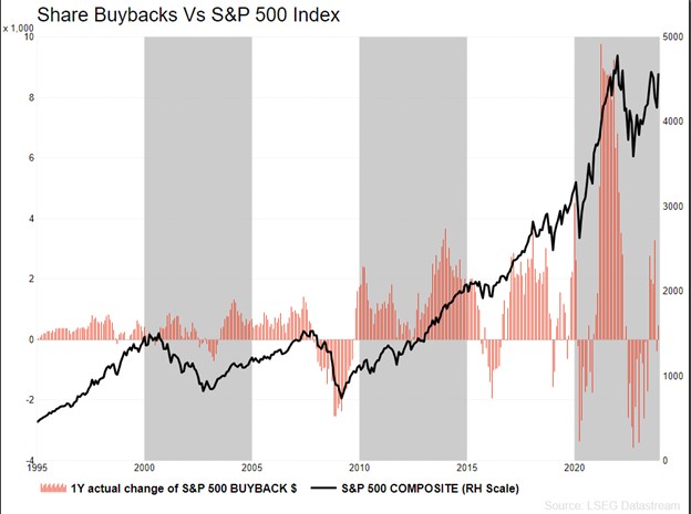 As discussed in that article, since 2008, share buybacks have accounted for nearly 40% of the market’s return.