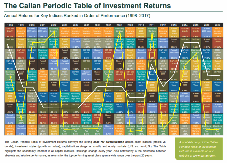 We traced out the returns of the S&P 500 and the Barclay’s Aggregate Bond Index for illustrative purposes. Importantly, you should notice that whatever is at the top of the list in some years tends to fall to the bottom of the list in subsequent years. “Performance chasing” is a major detraction from an investor’s long-term investment returns.