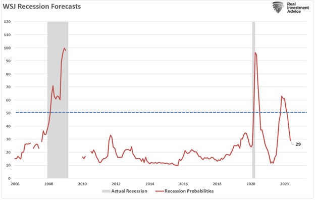 As we discussed recently, Wall Street economists increasingly believe the risk of recession has fallen sharply. To wit: