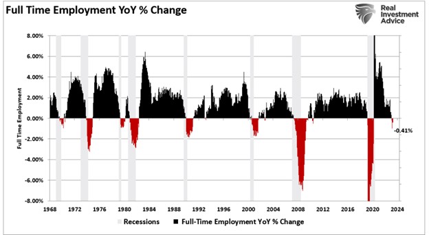 Of course, without employment, it is hard to increase economic consumption further. Notably, while we count part-time employment, those jobs do not provide the wages and benefits of full-time employment to support a family. Unsurprisingly, a key leading indicator to every previous recession has been a reversal of full-time employment.