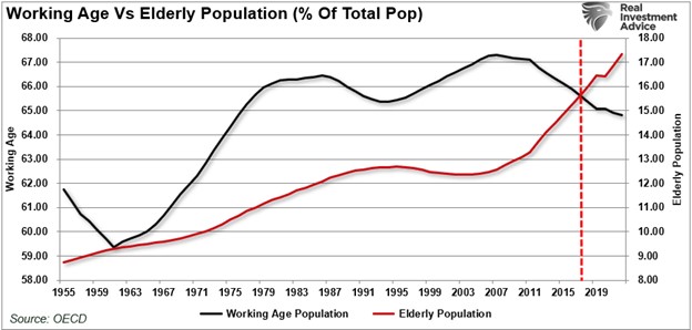 No matter how you calculate the numbers, the problem remains the same. Too many obligations and a demographic crisis. As noted by official OECD estimates, the aging of the population relative to the working-age population has already crossed the “point of no return.”