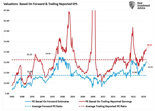 As shown, corporate earnings growth, which correlates with economic indicators like the ISM Manufacturing index, suggests some caution in the more optimistic Wall Street estimates. However, even if we include the services side of the index, which comprises the bulk of economic growth, and weight it accordingly, we see that the stock market has far outpaced underlying economic activity. Historically, such outsized returns were unsustainable as earnings growth could not meet expectations.