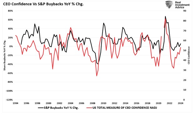 Adding to that exuberance is the increased demand for share repurchases, which has been a primary source of “buying” since 2000. As CEO confidence improves, a byproduct of increased consumer confidence, they increase the demand for share repurchases. As buybacks boost asset prices, investors take on more leverage and increase exposure as a virtual spiral develops.