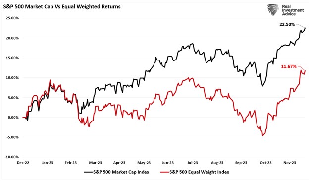 Given that Mega-capitalization stocks are a place of safety where major asset managers can place large amounts of capital, and the bulk of expected earnings growth will come from those companies, it is not surprising we are seeing the divergence again. However, while such a deviation is unsustainable long-term, the recent breakout to all-time highs may continue as “F.O.M.O” outpaces fundamentals and valuations. Given that the 24% advance in 2023 was primarily a function of valuation expansion, current valuation multiples are at risk of disappointment if earnings fail to achieve rather lofty expectations.