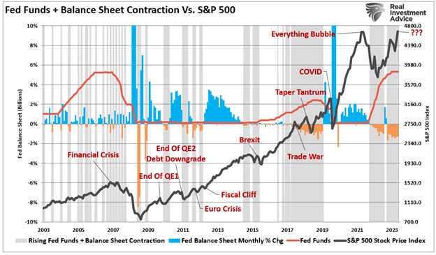 That analysis also corresponds to the Fed cutting rates as well. The chart below compares the Fed rate hiking cycle and its balance sheet contraction and expansion to the S&P 500 index. Since 2008, the Federal Reserve, through its messaging, has trained investors to respond to increased liquidity actions. Previously, markets tended to correct during periods of monetary tightening, as should be expected. However, this time, investors are front-running the Fed to get ahead of the reversal in monetary tightening.