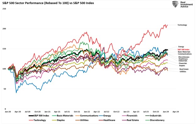 Another issue worth delving into with the market breaking out to all-time highs is the narrow participation in that rally. The chart below shows each market sector of the S&P 500 rebased to 100 as of January 2021. I have compared each to the S&P 500 itself. While the overall market is indeed reaching new all-time highs, it is the function of just one sector – Technology.