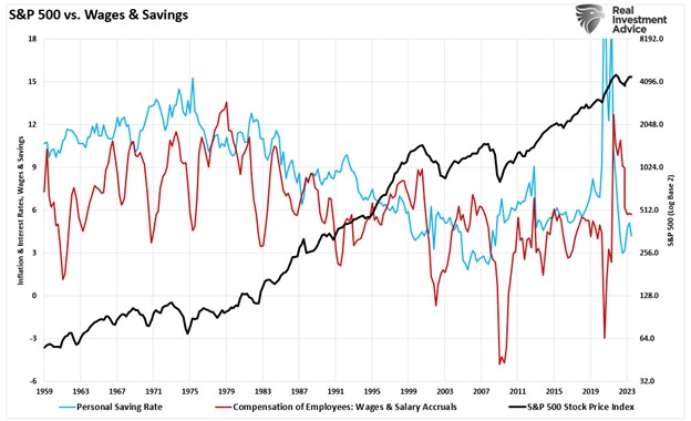 However, given that higher rates remain and consumers have drained most of their savings, there is likely only a limited impact on further improvements in confidence. While stocks are currently registering all-time highs, much of that gain is based on the assumption that the Federal Reserve will cut rates and reintroduce monetary liquidity.