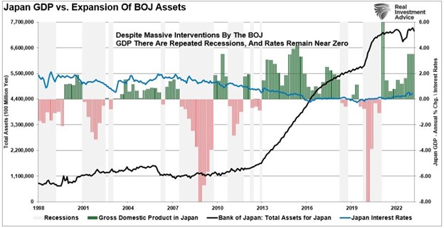 Surprisingly, there is no evidence of such. Maybe the situation would be markedly different if the Bank of Japan (BOJ) didn’t own most ETF, corporate, and government debt markets. However, such is also why Japan continues to be plagued by rolling recessions, low inflation, and low-interest rates. (Japan’s 10-year Treasury rate fell into negative territory for the second time recently.)