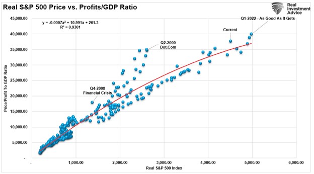 The correlation is more evident in the market versus the price-to-corporate profits ratio. Again, since corporate profits are ultimately a function of economic growth, the correlation is not unexpected. Hence, neither should the impending reversion in both series. Currently, that ratio is approaching levels that preceded more significant market reversions to realign the markets to profitability.