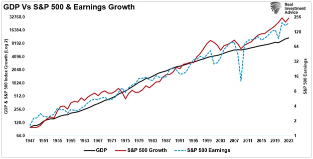 “While stock prices can deviate from immediate activity, reversions to actual economic growth eventually occur. Such is because corporate earnings are a function of consumptive spending, corporate investments, imports, and exports. The market disconnect from underlying economic activity is due to psychology. Such is particularly the case over the last decade, as successive rounds of monetary interventions led investors to believe ‘this time is different.’”