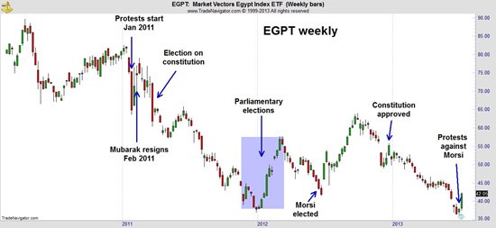 Egypt is in the headlines again as protestors mass for the second time in less than three years. If stability can be restored to the country, the stock market could be a buy.