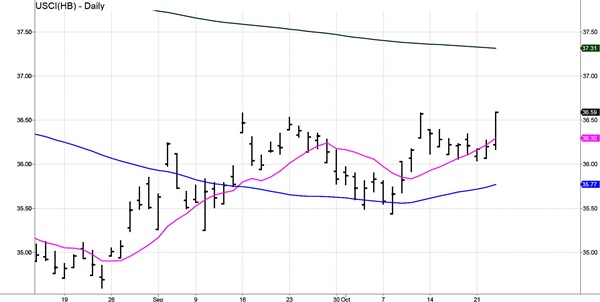 USCI signaled a long in early October when it cleared the 50-DMA (blue line).