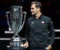 Roger Federer poses with the Laver Cup Trophy at TD Garden, Boston, Mass. on Sept. 24, 2021. (Getty Images)