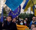Some held up banners saying “Ukraine will resist,” “Say no to Putin” or “Implement sanctions immediately,” while others wrapped themselves into huge Ukrainian flags.