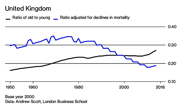 But that ratio is misleading and overly discouraging because it doesn’t take into account the decrease in mortality rates at older ages, says Andrew Scott, who is an economist at London Business School and co-author of The 100-Year Life: Living and Working in an Age of Longevity. Old people are less likely to die—and thus, presumably healthier and more capable of continuing to work—than they were in past generations, Scott wrote in a recent article for Project Syndicate called "The Myth of the ‘Aging Society.’"