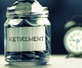 jar filled with coins with retirement written on white paper in black and alarm clock in back