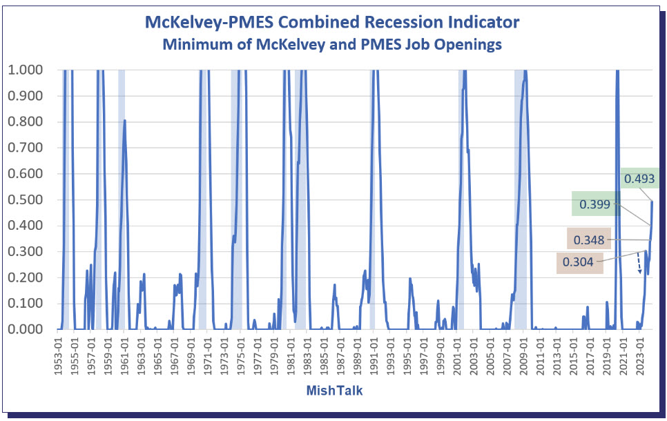 Over the last 11 recessions, there are no false positives or negatives on the McKelvey-PMES Combined Recession Indicator, except perhaps the current readings.