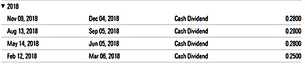 For 2018, the record shows the company paid $1.09 in regular dividends.