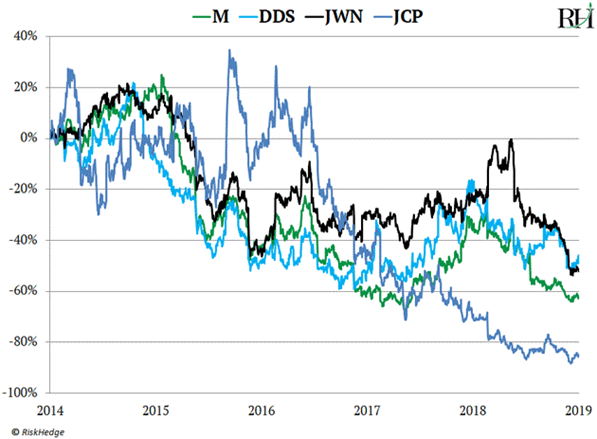 Toys 'R' Us, Sears, Bon-Ton, Borders, Circuit City, and RadioShack are all bankrupt.Meanwhile, many other middling retailers are barely clinging to life. Macy’s (M), J.C. Penney (JCP), Dillard’s (DDS), and Nordstrom (JWN) still have a pulse, but they’re fading fast — as you can see here: