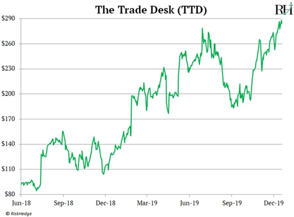 Longtime RiskHedge readers will remember I highlighted The Trade Desk (TTD) back in 2018. In short, Trade Desk is like a “stock exchange” for targeted ads. It’s making a killing as internet advertising continues to explode.