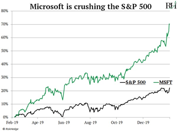 Microsoft (MSFT) has been on a tear over the past year. Shares of the software pioneer have jumped 70% since last February — triple the S&P 500’s gain, as you can see: