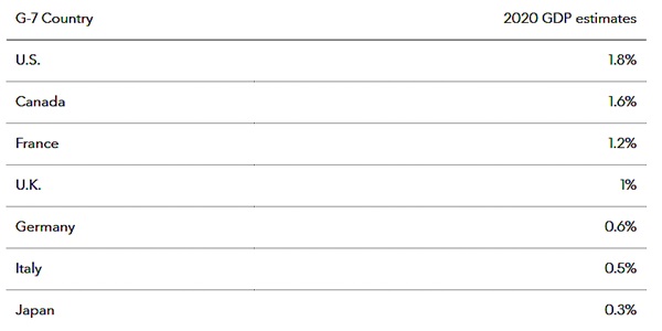 Which development model will prevail in 2020 remains to be seen. Economists surveyed by Bloomberg News are giving the U.S. an edge, with growth projected at 1.8%, versus 1.6% in Canada. Both forecasts are much higher than the other five G-7 countries, which are seen growing by an average 0.7%.