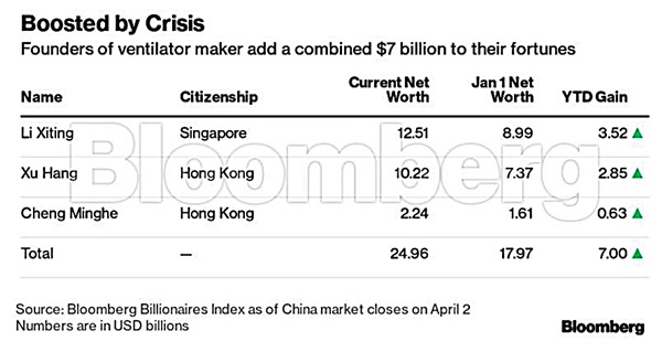 As the coronavirus pandemic wrecks economies, markets and fortunes, three founders of a company that makes ventilators have added a combined $7 billion to their wealth this year.