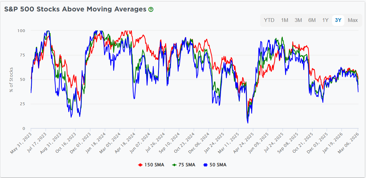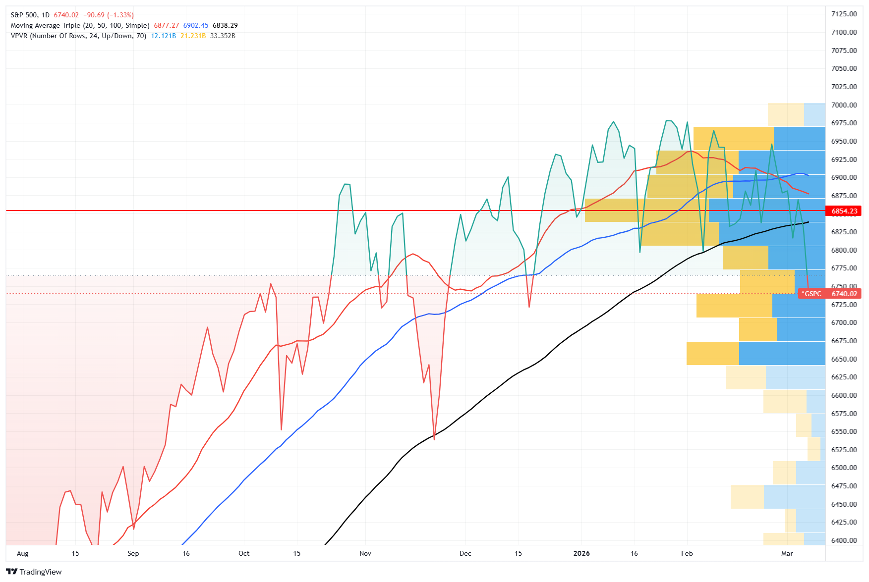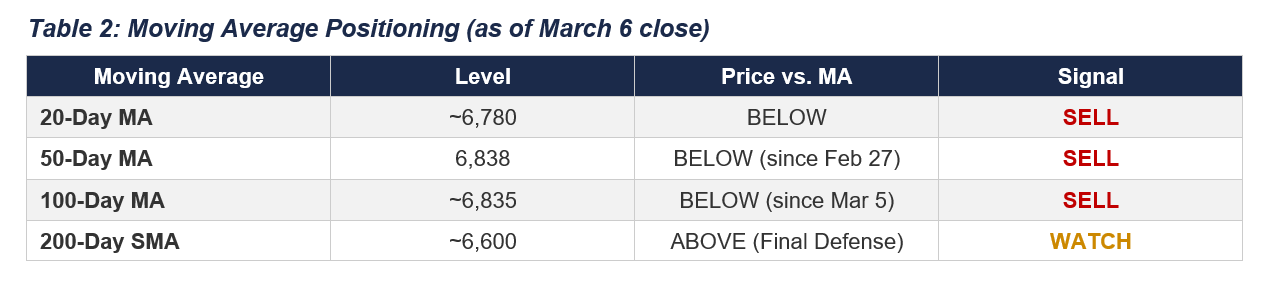 The most critical development is the systematic breakdown of every short-term moving average. The S&P 500 has been trading below its 50-day moving average at 6,838 since February 27. On March 5, it cracked the 100-day moving average near 6,835.