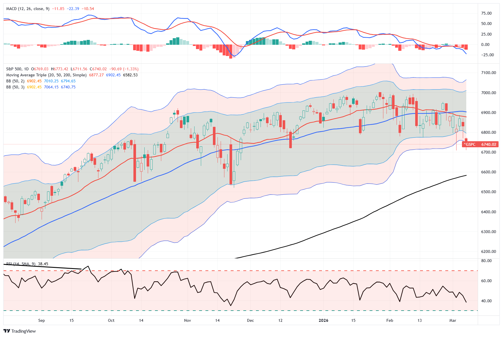 The MACD reading of -10.54 is also bearish, but approaching more oversold levels. The MACD line crossed below the signal line in late February while still above the zero line, a configuration that historically produces the highest-conviction sell signals. The histogram shows six consecutive deeper negative bars with no visible convergence, keeping downward pressure on markets near-term.