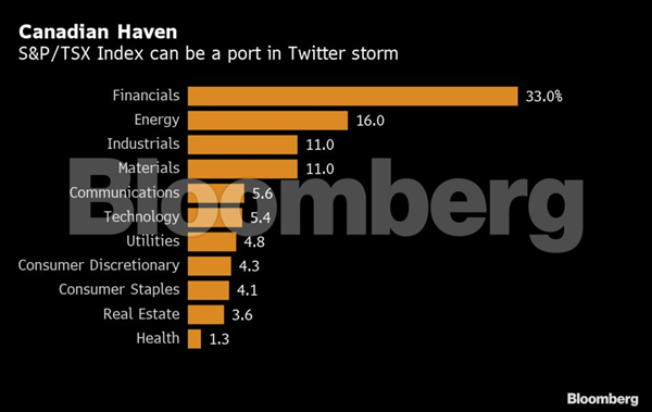 That’s helpful on days like today, when Trump signals he could wait for another year before striking a trade agreement with China, sending investors fleeing risk assets and piling into havens. While the S&P 500 Index fell as much as 1.4% Tuesday, the TSX slipped by only half that amount.