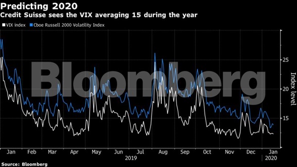 UBS Group AG strategist Stuart Kaiser predicts realized volatility on the S&P 500 Index will drop from about 19% in the first half of the year to 12% in the second half as growth trends turn positive and inflation momentum goes negative. Credit Suisse strategist Mandy Xu says it’ll average 13% over 2020 given that the Federal Reserve is on hold and likely to ease further if downside risks materialize. The VIX’s mean will be 15, Xu predicts, down slightly from 15.4 in 2019.