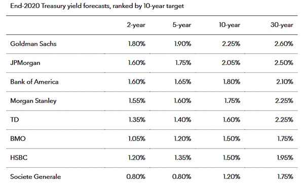 The biggest dealers of U.S. government securities have been dropping their forecasts for Treasury yields over the next year, and for the most part, their targets for where the 10-year benchmark will go are landing below 2%.