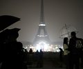 People gather at Trocadero plaza as the lights of the Eiffel tower are turned off, in Paris on Monday to pay tribute to Las Vegas and Marseille victims. (Kamil Zihnioglu/AP)