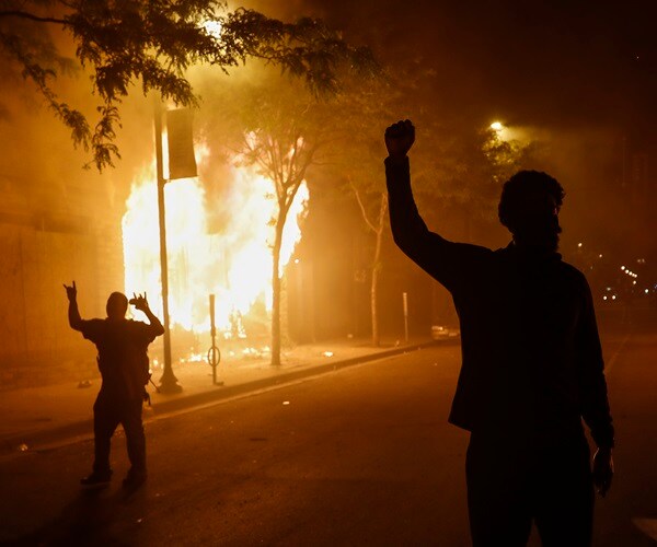 The demonstration turned violent at points. Fires burned near the CNN Center, the network's headquarters, and windows were smashed at its lobby. Several vehicles were torched, including at least one police car.