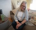 older woman sitting on couch looking at smartwatch on her wrist