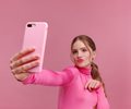 woman in all pink taking pictures of herself