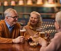 older man and women sitting at a table drinking beers